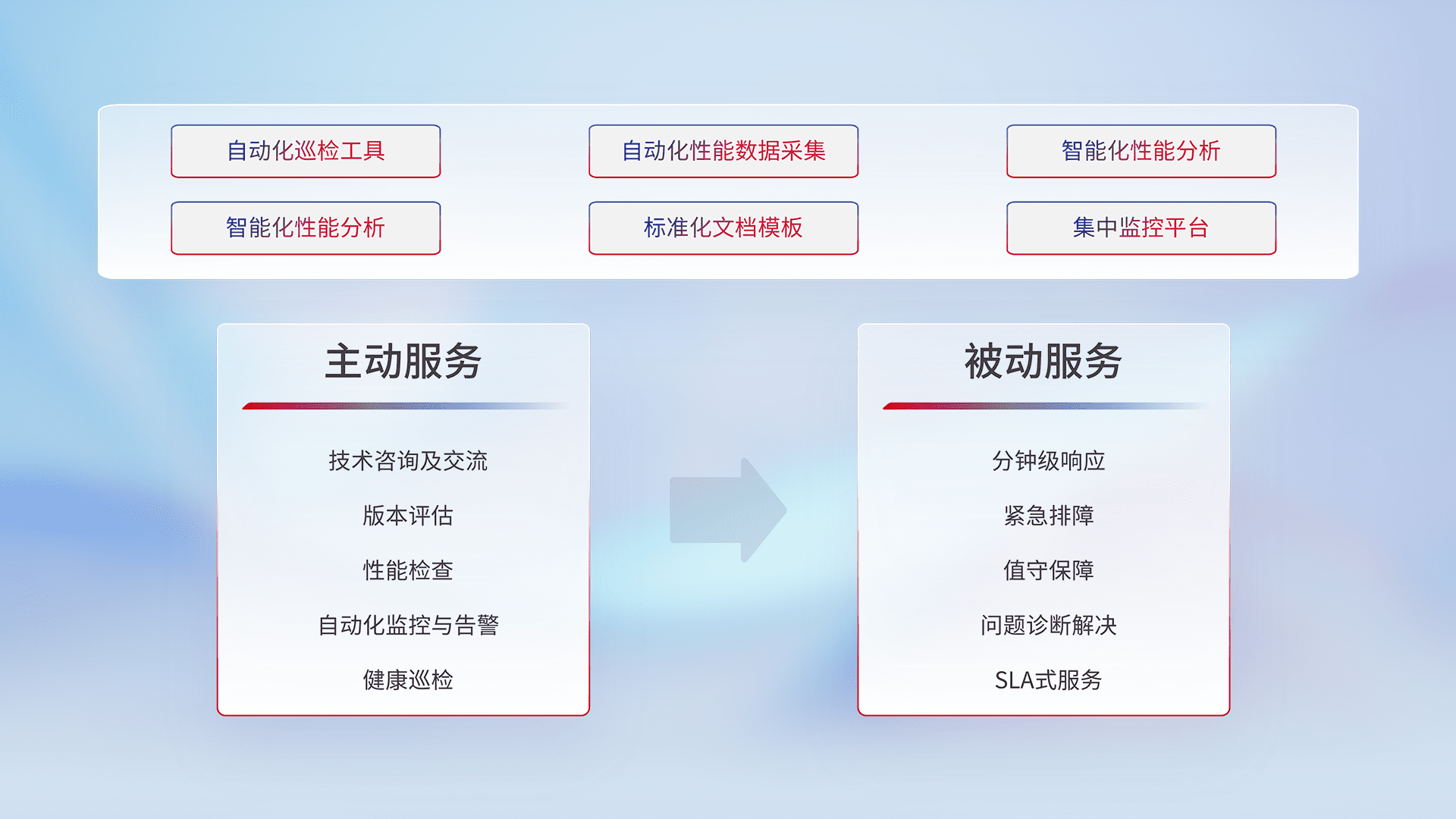 智能化工具和标准化文档,,保障服务质量,,,提供主动服务(包含技术咨询、、、版本评估、、、、性能检查、、自动化监控与告警、、、健康巡检)和被动服务包含(分钟级响应、、、紧急排障、、、值守保障、、、、问题诊断解决、、SLA服务)。。